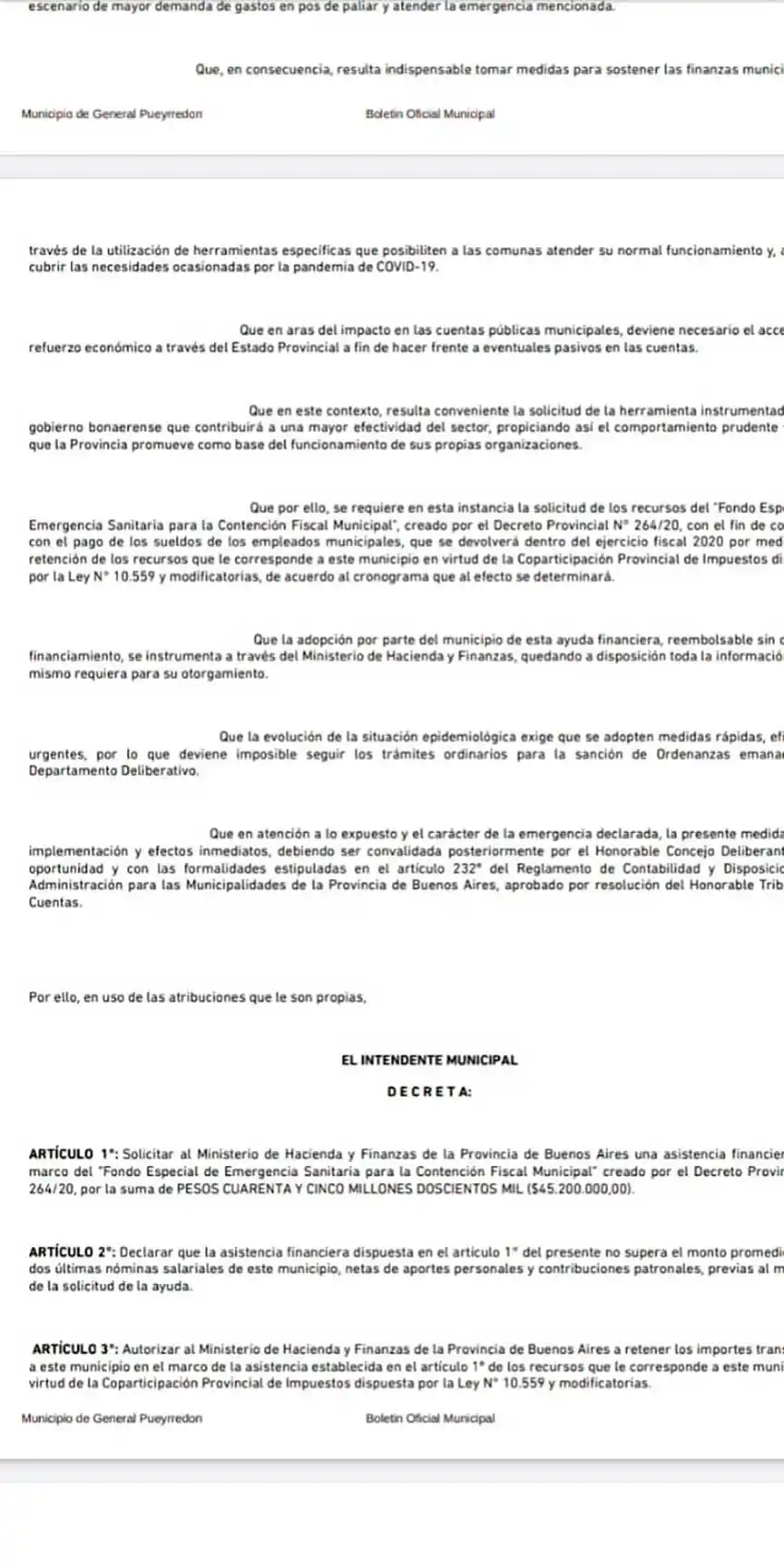 "La adopción por parte del municipio de esta ayuda financiera, reembolsable sin costo de financiamiento, se instrumenta a través del Ministerio de Hacienda y Finanzas. La evolución de la situación epidemiológica exige que se adopten medidas rápidas, eficaces y urgentes, por lo que deviene imposible seguir los trámites ordinarios para la sanción de Ordenanzas emanadas del Departamento Deliberativo", sentenció.