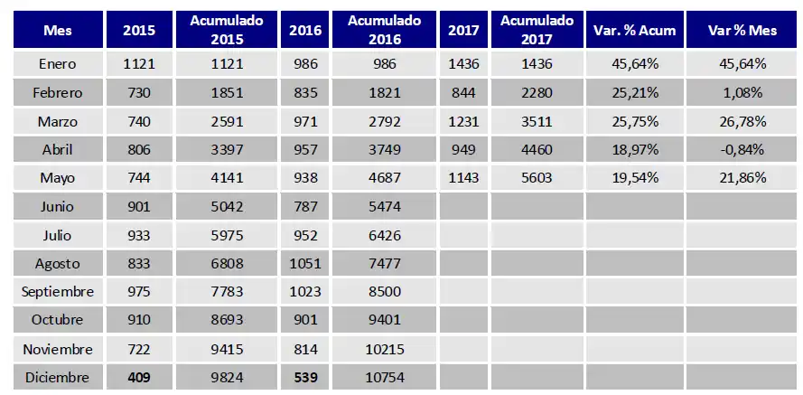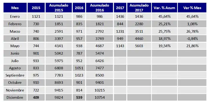 A nivel nacional, se registraron 77.445 vehículos, un 27,45% más que en mayo de 2016. Durante 2017 suman 372.967 nuevos patentamiento, un crecimiento del 31,53% interanual.