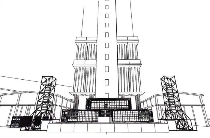 Para la propuesta artística se dispondrá un escenario principal previsto sobre la cabecera de los silos. Estará formado por tres contenedores ubicados sobre una plataforma metálica “Layher” y cada uno de ellos tendrá su propia iluminación artística, musical y de fantasía, con el aporte de módulos led de alta definición.