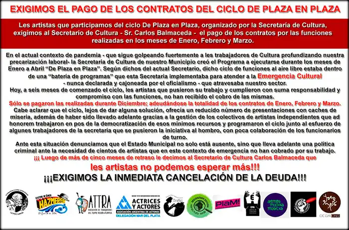 "Les artistas que participamos del ciclo De Plaza en Plaza, organizado por la Secretaria de Cultura, exigimos al Secretario de Cultura Carlos Balmaceda el pago de los contratos por las funciones realizadas en los meses de Enero, Febrero y Marzo", comentaron en el inicio del texto que llegó a la redacción de El Marplatense.