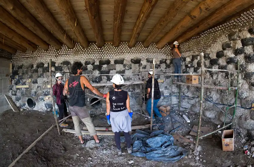 El primero es la construcción con materiales re utilizables. "Aproximadamente el 60% de los materiales utilizados en la construcción son re utilizables, neumáticos, botellas y latas", explicó el coordinador del programa de educación ambiental que además expuso que "es un edificio de 300 metros cuadrados aproximadamente".