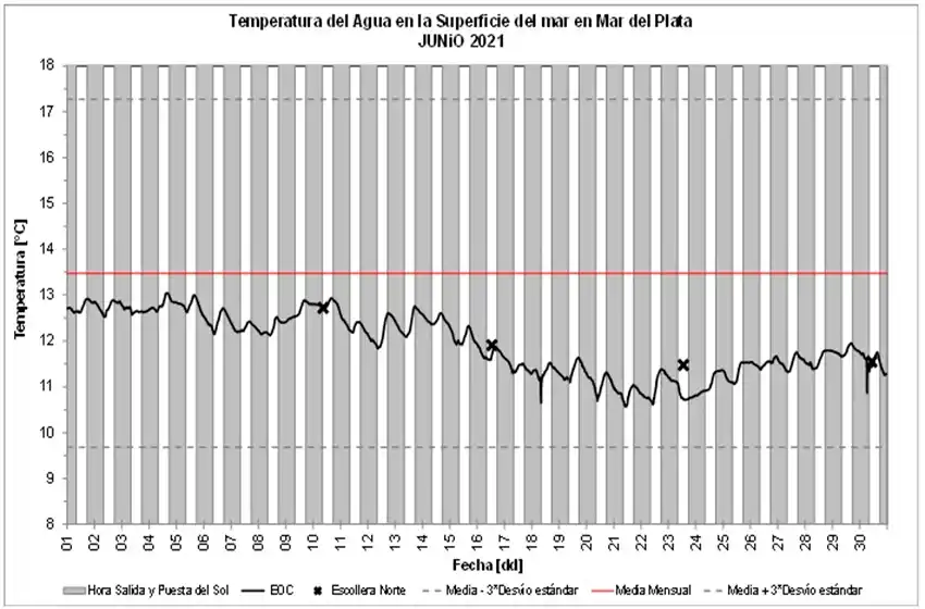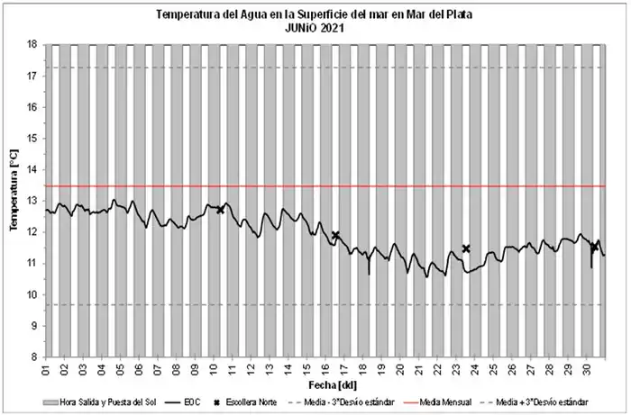 El Gabinete de Oceanografía Física del Instituto Nacional de Investigación y Desarrollo Pesquero (INIDEP) informó en las últimas horas la temperatura del agua en la superficie del mar en Mar del Plata durante junio de 2021.
