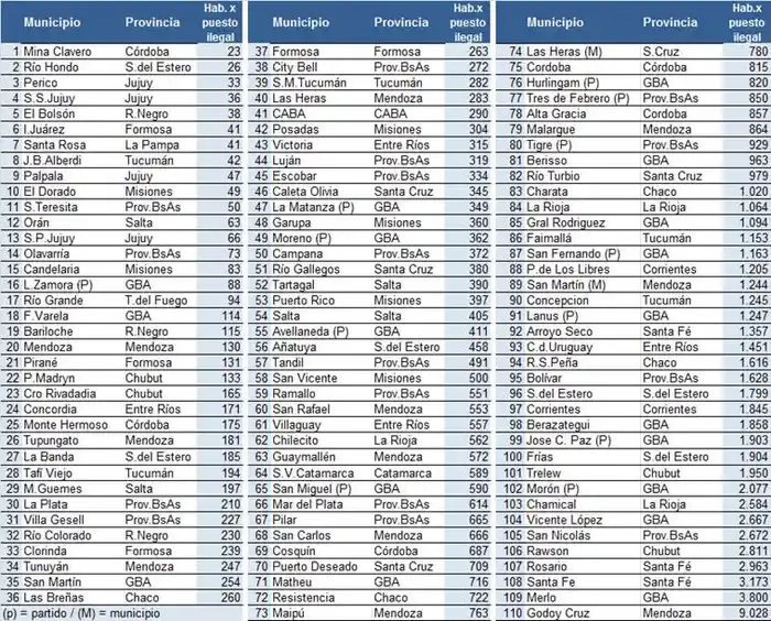 Las localidades que lideran este ranking son Mina Clavero (Córdoba) con un puesto cada 23 habitantes, Río Hondo (Santiago del Estero) con un puesto cada 26 personas y Perico (Jujuy) con uno cada 33 habitantes. En tanto, la Ciudad de Buenos Aires se ubica 41° con un puesto cada 290 habitantes.