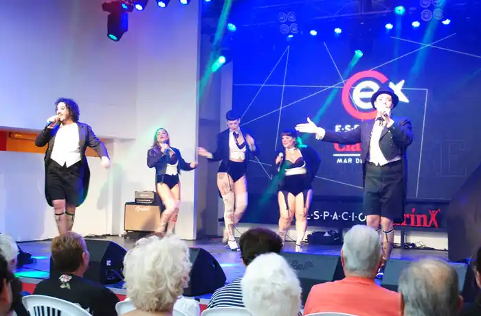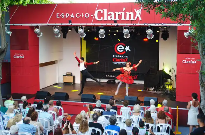 Espacio Clarín vivió una nueva jornada rodeada de numeroso público, música y baile. A las 19 subió al escenario el Ballet con Humor, integrado por bailarines varones del Teatro Argentino de La Plata y del Teatro Colón de Buenos Aires que, vistiendo “tutus” y calzando zapatillas de punta.