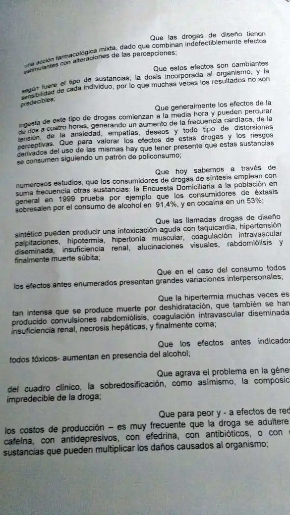 Para validar lo expuesto sobre los riesgos del consumo de drogas sintéticas, utilizan los resultados de una encuesta domiciliaria efectuada en el año 1999, a través de la cual indican que se probó que "los consumidores de éxtasis sobresalen por el consumo de alcohol en un 91,4% y en cocaína en un 53%". Además, se plantea que "en la década del '70 se comenzó a hablar de las fiestas electrónicas que se trataban de una gran cantidad de personas que se juntaban a bailar música electrónica mezclada por DJ's".
