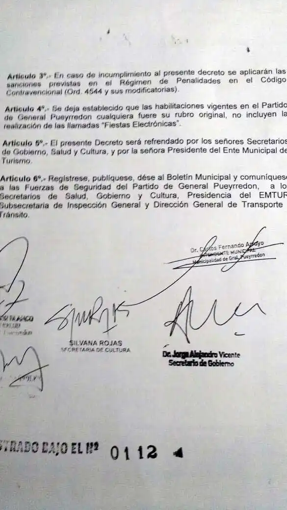 Por último, el decreto establece que "las habilitaciones vigentes en el Partido de General Pueyrredon, cualquiera fuere su rubro original, no incluyen la realización de 'Fiestas Electrónicas'".