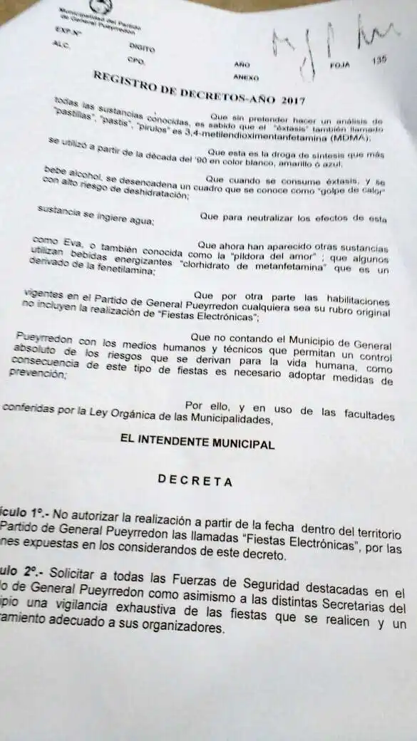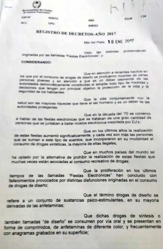 En el decreto, el Municipio reconoce no contar "con los medios humanos y técnicos que permitan un control absoluto de los riesgos que se derivan para la vida humana como consecuencia de este tipo de fiestas", por lo que considera "necesario adoptar medidas de prevención", y establece "no autorizar a partir de la fecha dentro del territorio del Partido de General Pueyrredon las llamadas 'fiestas electrónicas'".