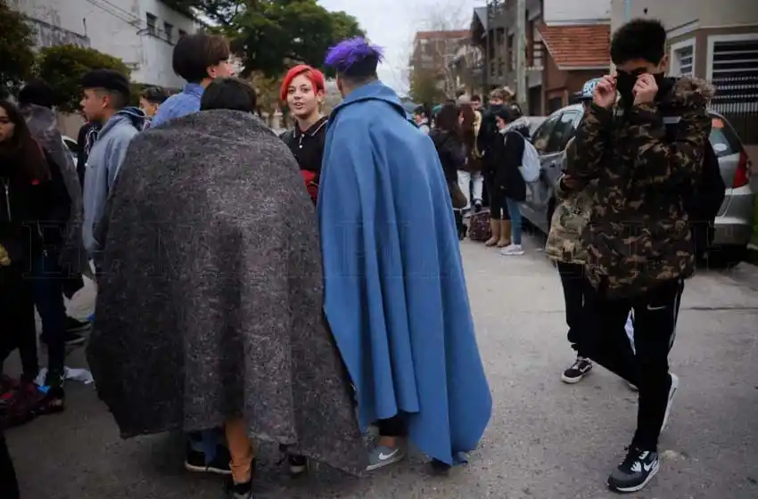 Esta mañana, alumnos de la Escuela Secundaria 4, ubicada en Formosa e Independencia, se manifestaron con un "frazadazo" en reclamo de la falta de calefacción que los afecta durante el periodo invernal.
