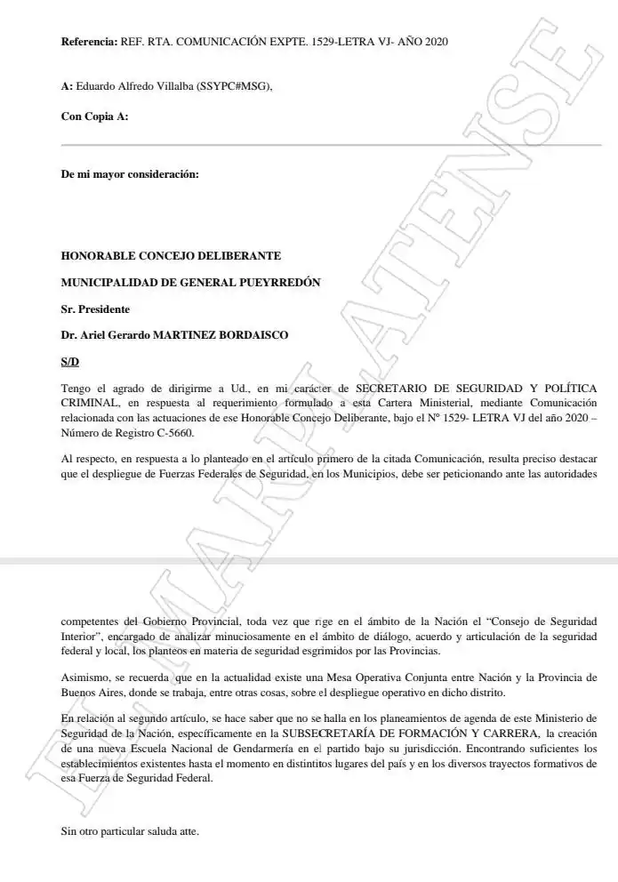 En la documentación oficial, a la cual El Marplatense tuvo acceso, el organismo que encabeza la Ministra Sabina Frederic indicó que “el despliegue de Fuerzas Federales de Seguridad, en los Municipios, debe ser peticionando ante las autoridades competentes del Gobierno Provincial, toda vez que rige en el ámbito de la Nación el Consejo de Seguridad Interior, encargado de analizar minuciosamente en el ámbito de diálogo, acuerdo y articulación de la seguridad federal y local, los planteos en materia de seguridad esgrimidos por las Provincias”.
