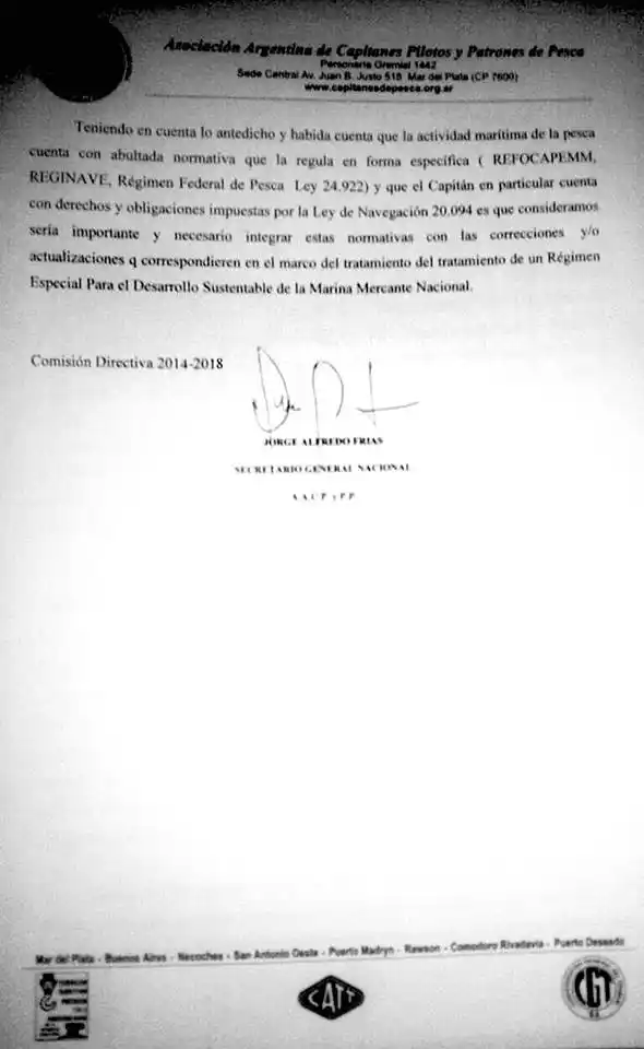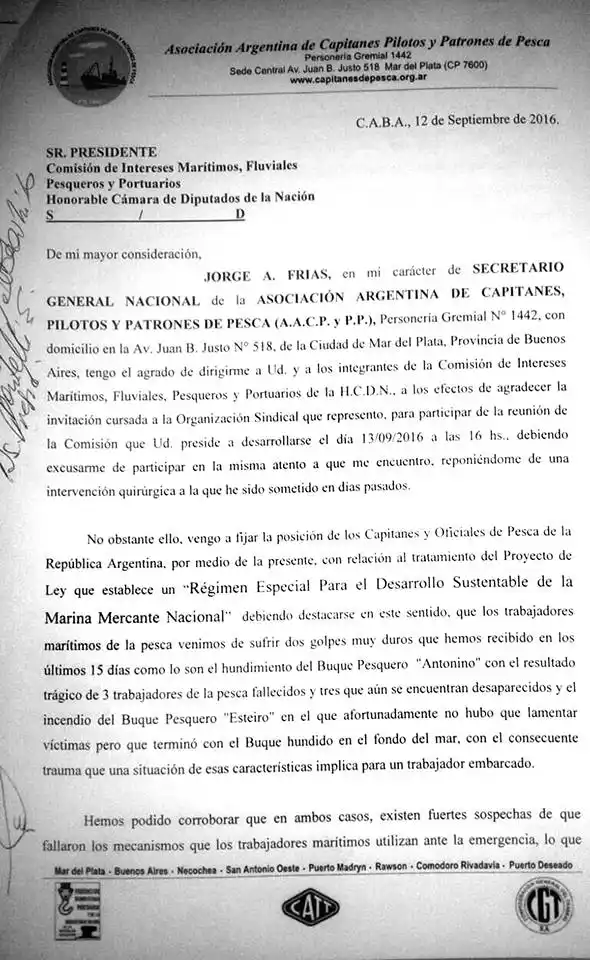 El Secretario General de la Asociación de Capitanes de Pesca, Jorge Frías, estuvo ausente del encuentro pero envió una nota dirigida al Presidente de Comisión a través de la cual se enumeraron distintos aspectos que, según se indica, "necesitan de pronta atención". Entre otras cuestiones, se considera "imperioso" iniciar una "profunda revisión de la legislación actual en materia de seguridad".