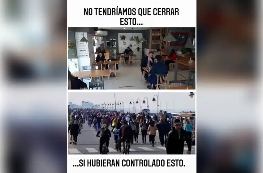 Las otras imágenes que circularon en las redes fue una suerte de comparación entre la cantidad de gente en la costa, apuntados como principales responsables de este retroceso por la falta de control, y la que se ubica en los restaurantes y gimnasios.