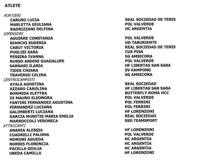 El entrenador de la Selección Femenina Italiana de Mayores, Roberto Carta, hizo su convocatoria para una Pre-Selección que estará concentrando del 18 al 23 de abril próximo en el Predio de Raduno, en Roma; el Centro de Alto Rendimiento donde se preparan los equipos de la “Azurra”.