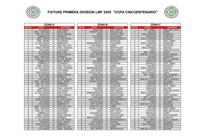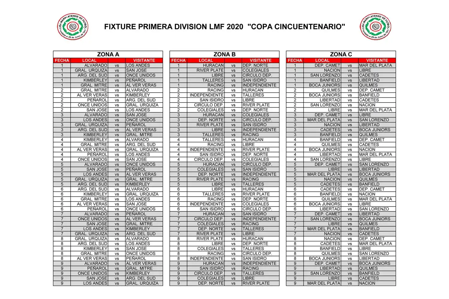 El departamento de fixture de la Liga Marplatense de Fútbol anunció en el día de hoy la conformación de las tres zonas en las que estarán divididos los 28 equipos de Primera División para disputar la primera fase del Torneo "Copa Cincuentenario". Además, en la reunión de Consejo Directivo quedó aprobado el fixture para esta instancia.