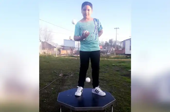 Nicolás, el niño más grande, ya es una estrella del circo. En la función, solía vestirse como muñecos de dibujos animados y luego fue designado como payaso. Ahora, está adquiriendo habilidades en malabares rebotes con una destreza de alto nivel.