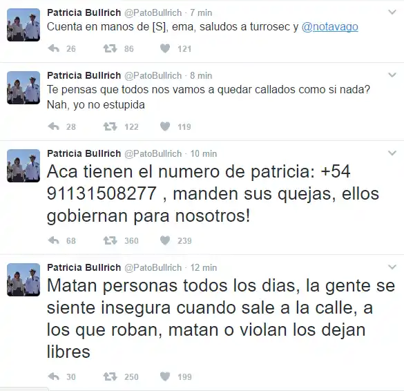 Con mensajes como "Macri gato" y "Cuenta en manos de [S], ema, saludos a turrosec y @notavago", quedó en evidencia que la red social no era manejada por Bullrich, de quien se publicó el número de celular. "Matan personas todos los días, la gente se siente insegura cuando sale a la calle, a los que roban, matan o violan los dejan libres", indica una de las publicaciones.