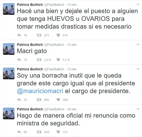 La cuenta de Twitter de Bullrich, con más de 326.000 seguidores, comenzó poco antes de las 16 a tuitear una serie de mensajes con insultos hacia la ministra de Seguridad y el presidente Mauricio Macri.