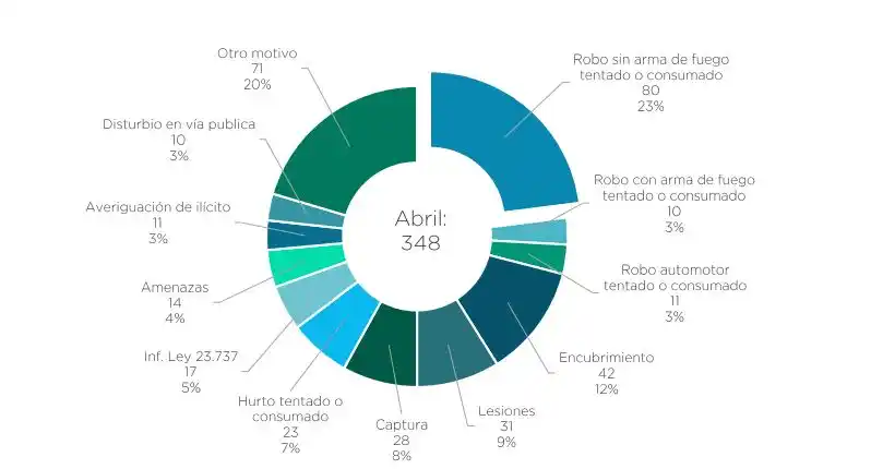 Durante el mes pasado se realizaron 348 procedimientos. El robo sin arma de fuego tentado o consumado fue el rubro que más actuaciones requirió, con 80 (23%), lo sigue encubrimiento, 42 (12%), y lesiones 31 (9%). En importancia numérica lo siguen las capturas, hurtos, robos con arma de fuego y tenencia de estupefacientes.