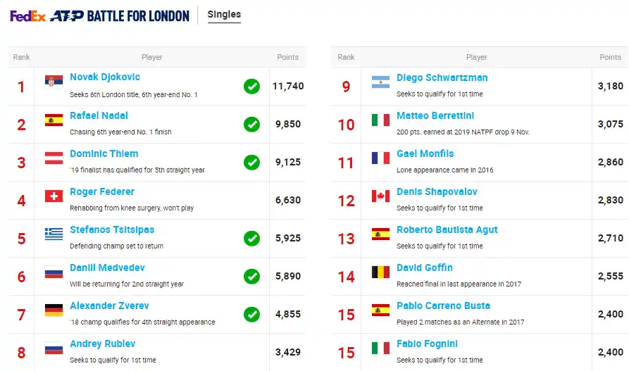 En lo que respecta a los “8 mejores” de la Carrera a Londres en singles, las esperanzas de Argentina se concentran en el gran 2020 de Diego Schwartzman. “El Peque” está ante una posibilidad histórica de clasificación para su carrera y para el país, que desde la última aparición de Juan Martín del Potro en 2013, no tiene representantes argentinos en el Torneo de Maestros.