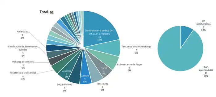 La Policía Departamental informó de 371 aprehensiones. La mayor parte de ellas estuvieron originadas en intervenciones por disturbios en la vía pública. Detrás se ubicaron las originadas en capturas, tentativas de robo sin arma de fuego, robos sin arma de fuego y encubrimientos.