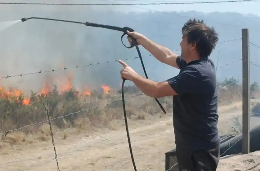 El panorama es desolador, no se anuncian lluvias y los bomberos no dan abasto pese a sus esfuerzos. Por eso, el consejo a los vecinos del lugar es tratar de humedecer las zonas donde el fuego pueda propagarse, y en esa tarea está comprometido Damián desde hace varios días.