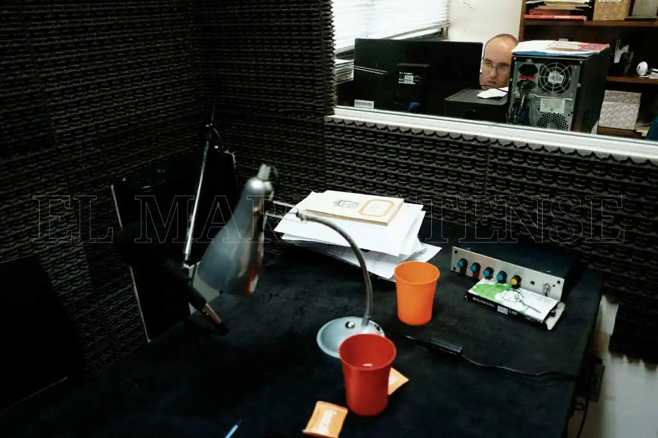 Al final del pasillo se encuentra el estudio de grabación. Una pequeña sala equipada como un estudio de radio en el que los voluntarios realizan las grabaciones.