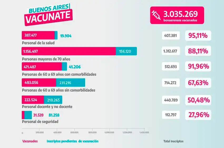 En un informe que difundió el Poder Ejecutivo, se detalló que ya son 3.035.269 los bonaerenses vacunados contra el Covid-19 en los más de 700 puntos dispuestos en los 135 municipios.