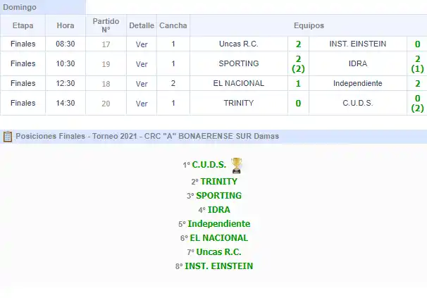 A pesar de tener un plantel con muchas jugadoras de Quinta División, Unión del Sur sigue ganando. Esta vez, se impuso por penales australianos en la final del Regional de Clubes “A” Bonaerense Sur ante Trinity por 2 a 0, después de un 0 a 0 en el partido. Gran trabajo del equipo dirigido por Karina Pagnussat que disfrutó de 4 grandes dias de juego. Sporting completó el podio al vencer por Shoot Out a IDRA.