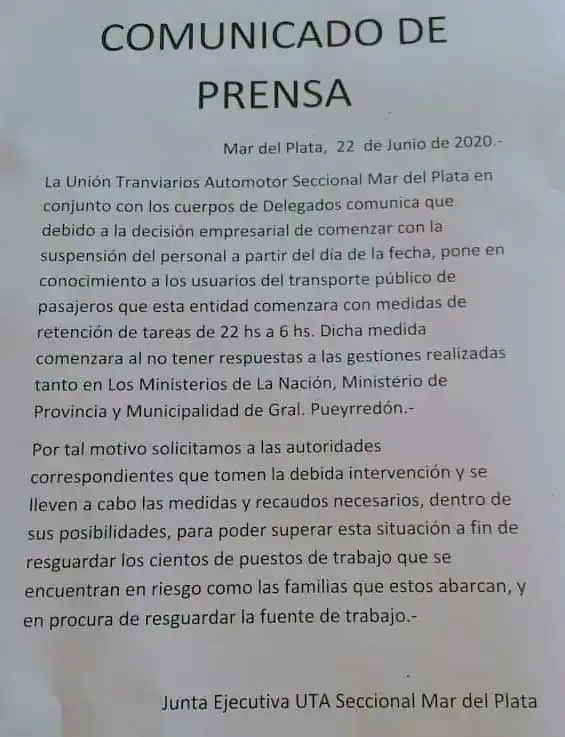 Dicha medida se da "al no tener respuestas a las gestiones realizadas tanta en los ministerios de la nación de provincia y en la municipalidad General Pueyrredon". "Por tal motivo solicitamos a las autoridades correspondientes que tomen la debida intervención y se lleven a cabo las medidas y recaudos necesarios dentro sus posibilidades para poder superar esta situación a fin de resguardar los cientos de puestos de trabajo que se encuentran en riesgo como las familias que estos abarcan y en procura de resguardar la fuente de trabajo", indicaron desde el gremio.