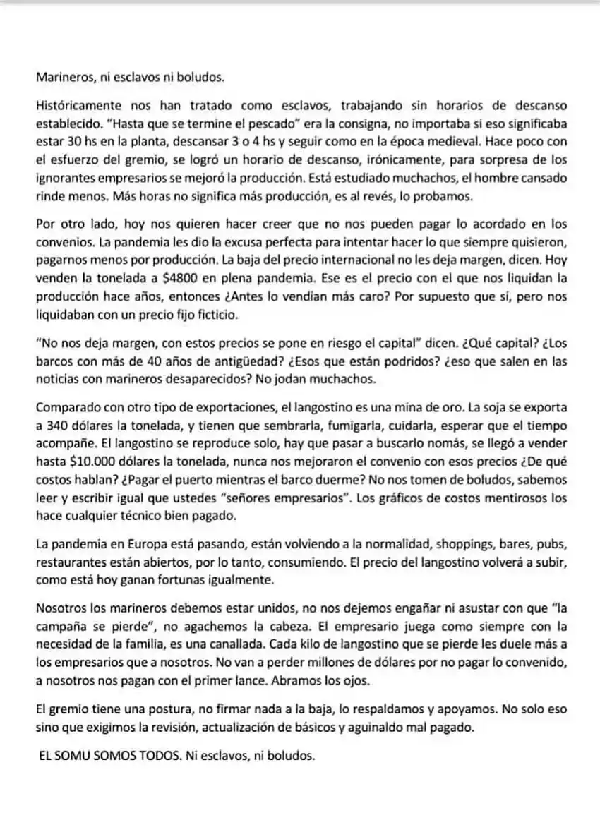 Asimismo, en el comunicado titulado "Marineros, ni esclavos ni boludos", el sindicato sentenció: "Nos quieren hacer creer que no nos pueden pagar lo acordado en los convenios. La pandemia les dio la excusa perfecta para hacer lo que siempre quisieron, pagarnos menos por producción".