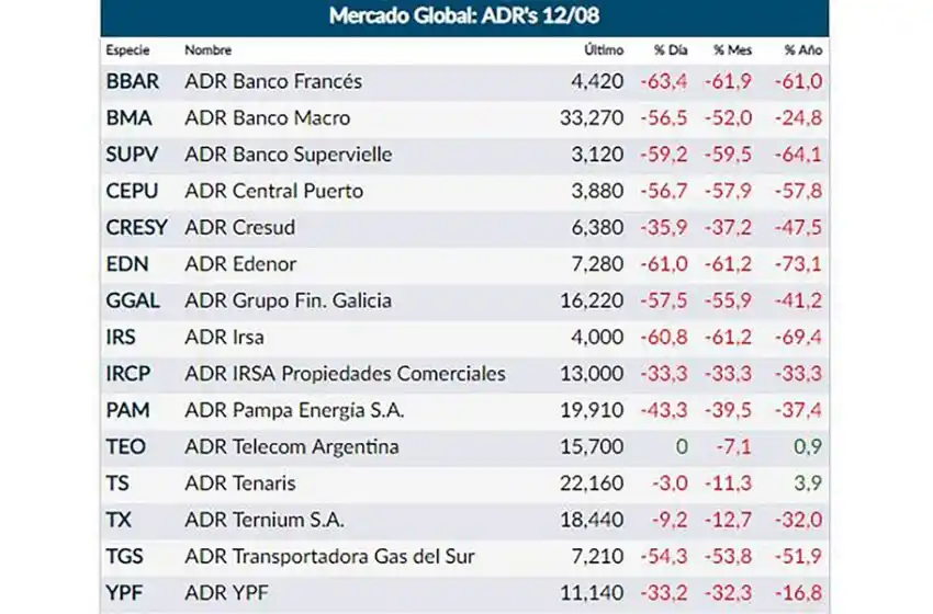 Los peores resultados para los papeles locales, pocos minutos después de la apertura, fueron para los bancos. Las acciones (ADRs) de Grupo Financiero Galicia, caían más del 57,5%, y las del Grupo Supervielle estaban por debajo del 59%. Las energéticas Pampa Energía se negociaban con una baja de 43%, Edenor 61% y las de YPF con una caída de 36,72%. Mercado Libre, la empresa más valiosa del país, que llegó a tener un market cap de casi USD 40.000 millones, perdía más de 12% esta mañana.