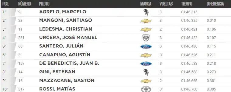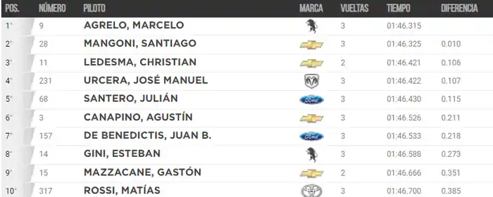 El listado del top ten lo completaron Juan Bautista De Benedictis (Ford), Esteban Gini (Torino), Gastón Mazzacane (Chevrolet) y Matías Rossi (Toyota).