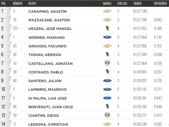 Canapino fue, con un tiempo de 1:27.744, el más rápido de la prueba clasificatoria en Centenario, y se alzó con su octava pole position en la categoría dando inicio al segundo fin de semana de actividad para el Turismo Carretera en la presente temporada.