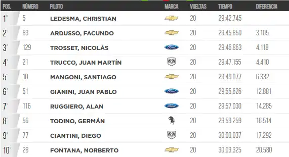 A partir de ahí, el marplatense sostuvo su buen ritmo y no intentó hacer nada más porque sabía que tenía una distancia demasiado grande. Por la tarde, una vez finalizada la carrera Ledesma, heredó el triunfo por las exclusiones de Urcera (Chevrolet) y Bonelli (Ford). Facundo Ardusso (Chervolet) y Nicolás Trosset (Ford) completaron el podio.