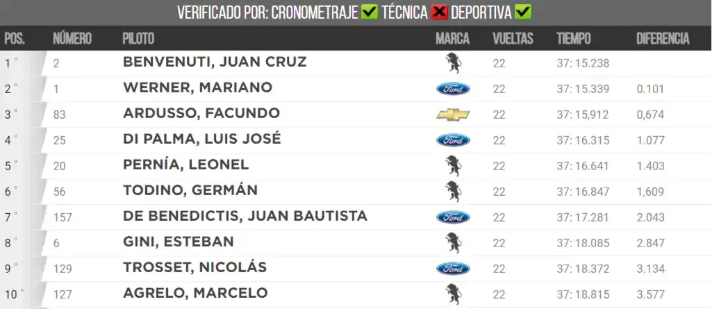 Y en esa última oportunidad, Benvenuti no desaprovechó: en el último giro de la carrera aceleró por afuera, resistió ante la defensa de Werner y le arrebató el liderazgo con contundencia y, sobre todo, con determinación. En la segunda mitad del trazado, el entrerriano intentó recuperarse y se acercó aunque no le alcanzó: cruzó la bandera a cuadros 101 milésimas por detrás de Benvenuti.