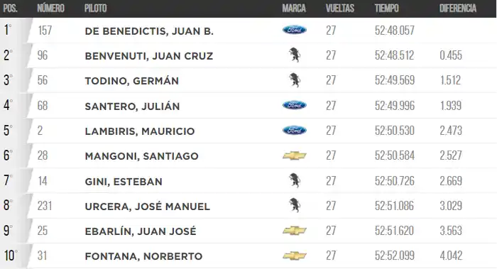 Ya en la tercera serie de la mañana, el marplatense pudo aprovechar un toque entre Gianini y Catalan Magni que terminó con este último por el pasto. Lo aprovechó el piloto de nuestra ciudad para quedar en el segundo puesto y empezar a separarse de sus perseguidores. No le alcanzó para ir a buscar el triunfo parcial, pero lo dejó en una muy buena ubicación pensando en la final.