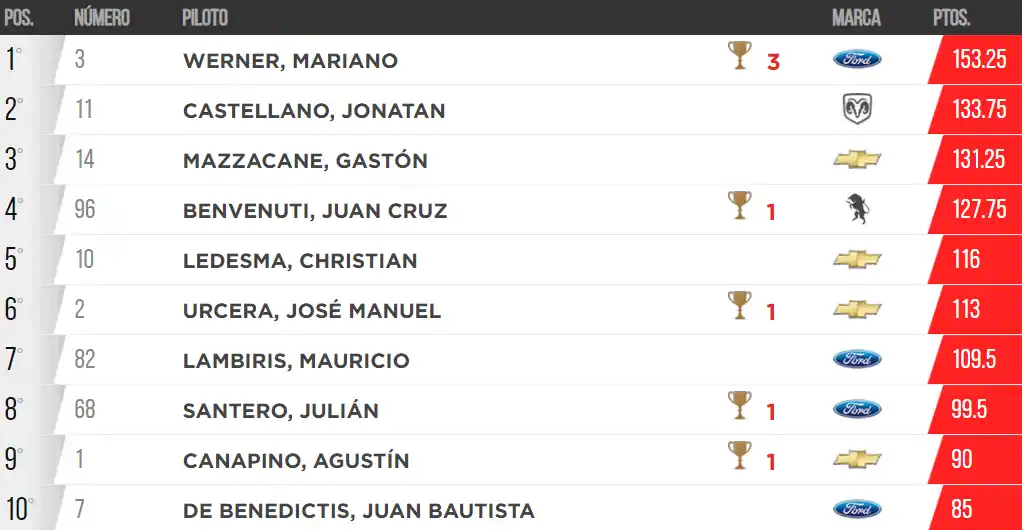Mariano Werner tenía la opción de ser campeón e incluso en el inicio de la carrera cuando fueron a buscarlo, no se metió en el roce porque sabía que si todo se mantenía como estaba, no tenía necesidad alguna de forzar situaciones. Detrás quedó Christian Ledesma que largó séptimo y concluyó la competencia en el sexto puesto. Tuvo su oportunidad en un momento que parecía irse de cola el auto de Werner, pero no pudo pelearle la posición.