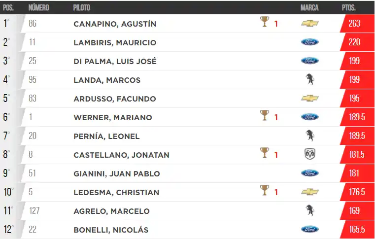 Con las sanciones del final, sumado a lo que sucedió con Aguirre, Ledesma terminó en el 19° puesto y Ugalde en el 20°. Para el piloto de Chevrolet, es un buen resultado después de la victoria en la fecha anterior y porque además, subió al 10° puesto del campeonato.