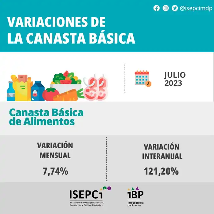 El valor de la Canasta Básica de Alimentos (CBA) fue de $ 95.977, registrando una suba de 7,74% respecto a junio. En lo que va del 2023, desde diciembre de 2022, la misma CBA tuvo un incremento acumulado de 69%, mientras que en los últimos doce meses desde julio de 2022, la suba fue de 121%.