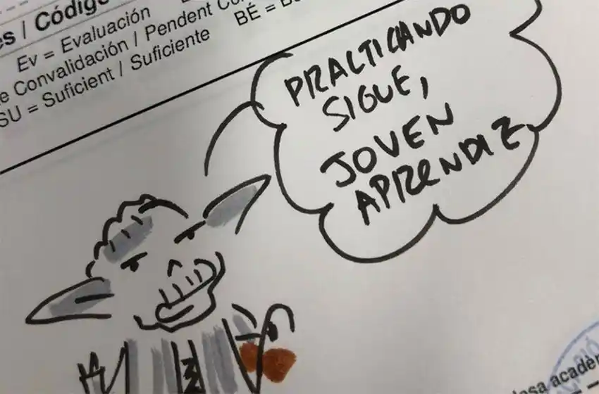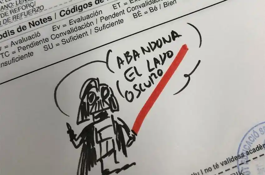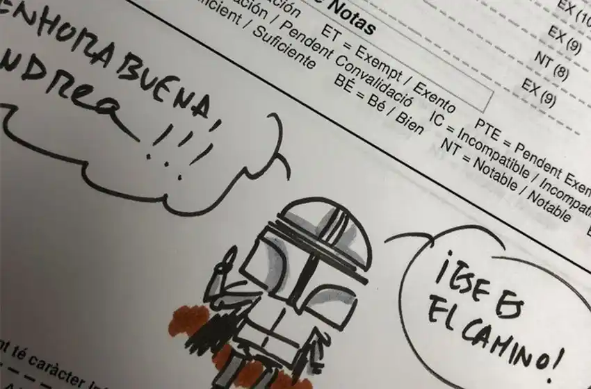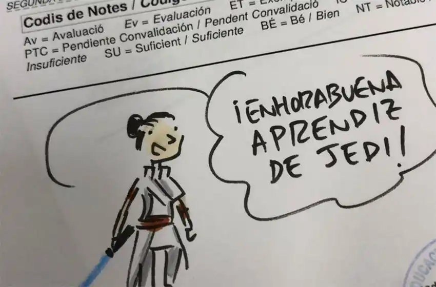 A su vez, el docente le dibujó un mandaloriano con el siguiente mensaje: “Ese es el camino”. “Enhorabuena aprendiz de jedi”, le puso a otro alumno con la ilustración de la princesa Leia. El tuit en el que el profe mostró sus dibujos con el texto "Boletines en 1ESO. Notitas del tutor Star Wars Style", rápidamente se viralizó con más de 14 mil "likes" y unos 2.600 "retuits".