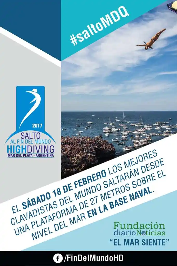 Se disputará este sábado en Mar del Plata el “High Diving”, una competencia en la que los siete mejores clavadistas del mundo saltarán desde una plataforma de 27 metros sobre el nivel del mar en la Base Naval. La competencia, denominada “Salto al fin del mundo 2017”, se disputará desde las 16 y la entrada será libre y gratuita.