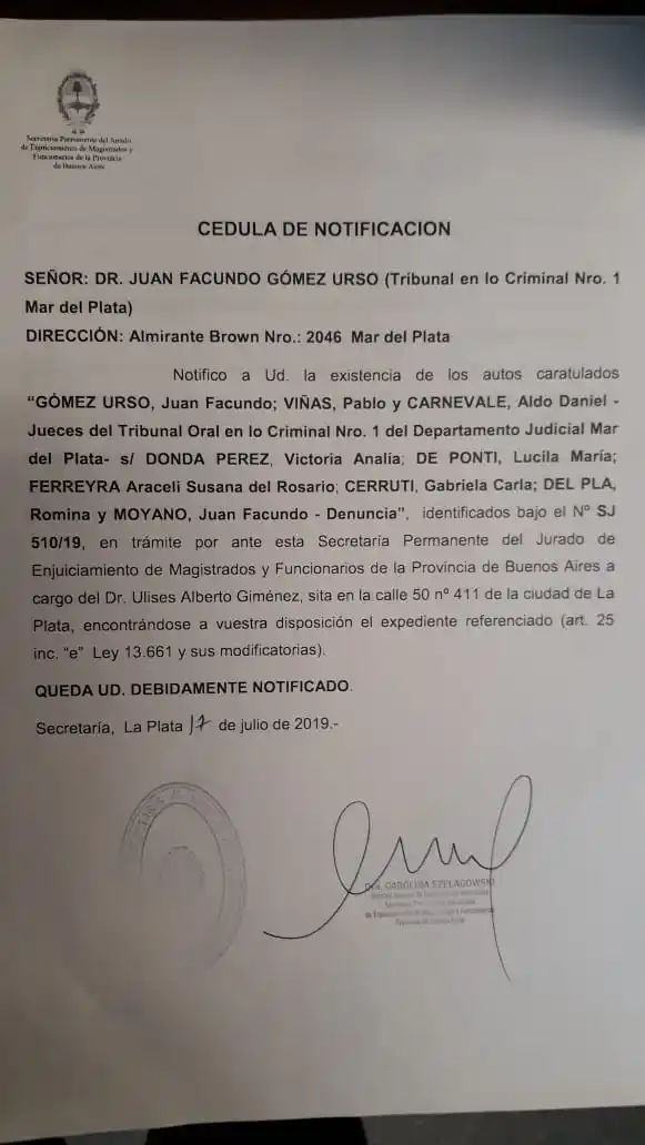 Por el momento, la denuncia efectuada por la Diputada Victoria Donda, De Ponti Lucila, Ferreyra Araceli , Cerruti Grabiela, Del Pla Romina y Moyano Facundo, no fue desestimada como suele suceder y se avanza con la conformación del jurado. La misma se realiza a través de un sorteo.