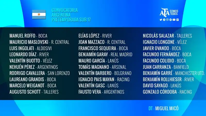Los entrenamientos del Sub-17 se hacen bajo las órdenes del Director Técnico Miguel Micó, en el predio de Ezeiza. De lunes a viernes los ensayos se desarrollarán en turno tarde y el sábado serán por la mañana.
