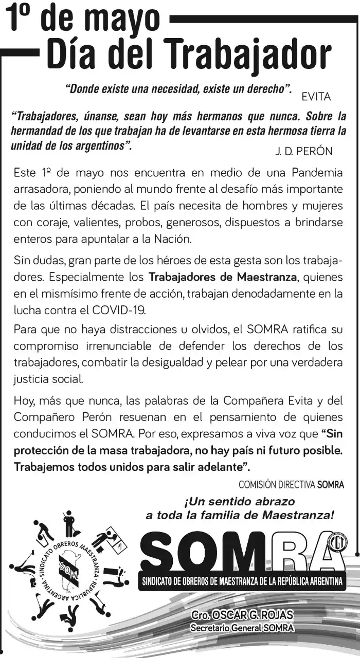 En el marco del Día del Trabajador, el Sindicato de Obreros de Maestranza de Argentina emitió un comunicado en el que destacó el trabajo de aquellos que están hoy en día en el frente de acción y “trabajan denodadamente en la lucha contra el COVID-19”.