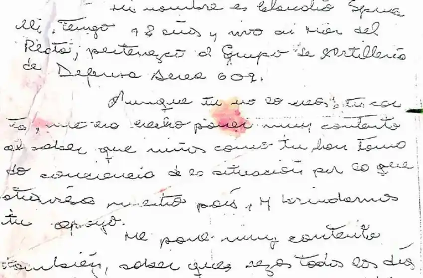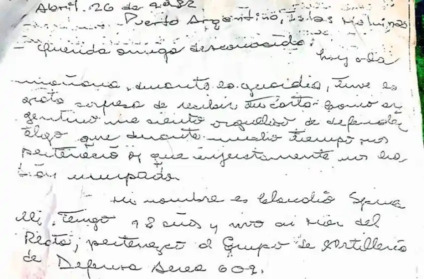 "Abril 26 de 1982. Puerto Argentino, Islas Malvinas. Querida Amiga Desconocida: Hoy a la mañana, durante la guardia, tuve la grata sorpresa de recibir tu carta. Como argentino me siento orgulloso de defender algo que durante mucho tiempo nos perteneció y que injustamente nos han usurpado. Mi nombre es Claudio Spinelli, tengo 18 años y vivo en Mar del Plata, pertenezco al grupo de artillería de defensa aérea 601. Aunque tú no lo creas, esta carta me ha hecho poner muy contento al saber que niños como tú han tomado conciencia de la situación por la que atraviesa nuestro país, y brindarnos tu apoyo. Me pone muy contento, también, saber que rezas todos los días pues el apoyo de Dios es fundamental y más en estos momentos en que las cosas se agravan a pasos agigantados. Es en estos momentos cuando valoro a mi familia y si algún consejo te puedo dar es que valores a tu familia y obedezcas a tus padres, que ellos desearán lo mejor para vos. Pese al gran frío y a veces al hambre que pasamos, estamos orgullosos y con la moral muy alta, dispuestos a defender la patria hasta las últimas consecuencias. Bueno, espero que tengas fe en Dios que todo va a salir bien. Espero recibir una nueva carta. Tu amigo soldado clase 63, Spinelli Claudio, batería comando brigada 601".