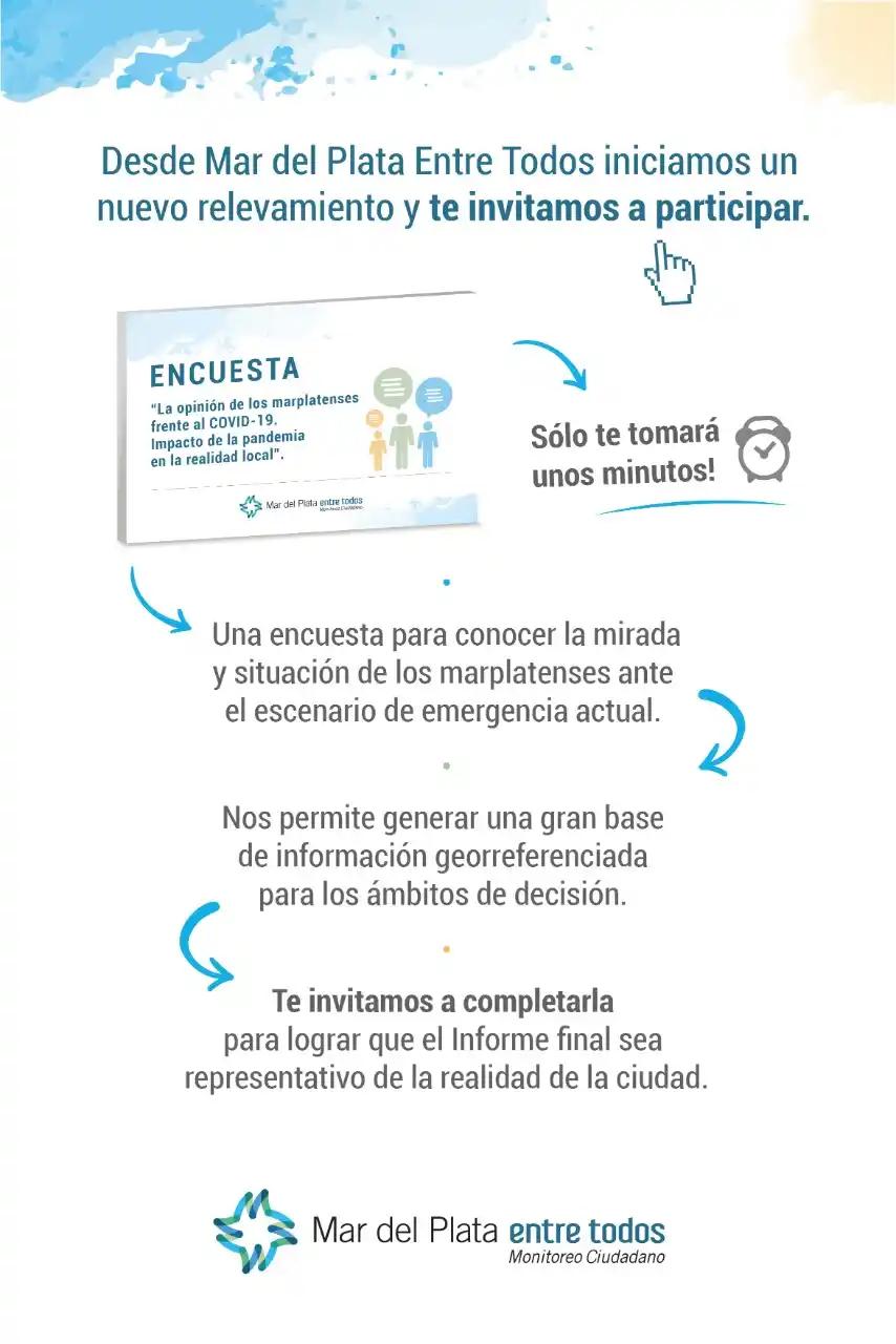 La Red Mar del Plata Entre todos proyecta un informe para conocer la mirada y situación de los ciudadanos ante el escenario de la emergencia sanitaria por el COVID-19. Para eso, lanzó este lunes la encuesta: “La opinión de los marplatenses frente al COVID-19. Impacto de la pandemia en la realidad local”.