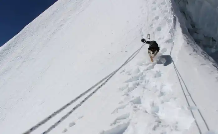 En ese momento empezó a seguirlos, se hicieron amigos, compartieron carpa, comida y también dificultades. De hecho, la perra tuvo miedo de bajar con los montañistas a su campamento base del Baruntse y pasó dos noches durmiendo en el glaciar, a 6.126 metros de altura.