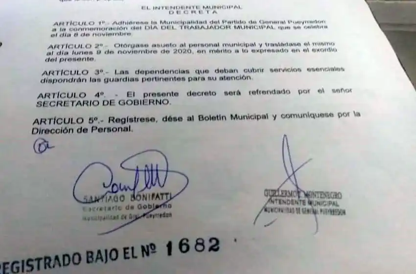El Día del Trabajador Municipal se conmemora el 8 de noviembre pero el jefe comunal decidió pasar el asueto para el lunes, día hábil, de acuerdo a lo consignado en el decreto al que este medio tuvo acceso.