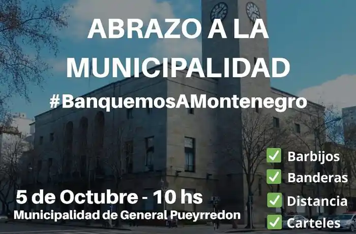La propuesta de los seguidores partidarios del Intendente circuló durante este domingo por redes sociales. "Un abrazo a la Municipalidad" en apoyo al Jefe Comunal fue convocado para este lunes a las 10, bajo la consigna #BanquemosAMontenegro. Precisamente, como se menciona, el pedido de Montenegro fue que no se lleve a cabo.