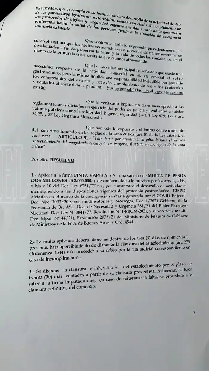 En el documento, el juez de Faltas sostuvo que "las actividades que conllevan a la circulación de personas especialmente en espacios cerrados, como el caso que nos ocupa, sin respetar los protocolos de funcionamiento, ni horarios, ni medidas de distanciamiento implican un alto riesgo de transmisión de virus".
