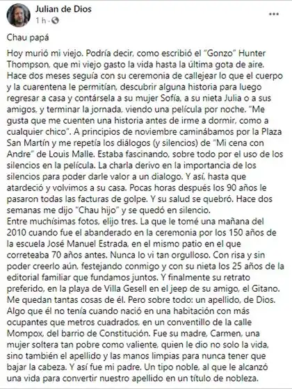 El periodista Horacio de Dios murió en las últimas horas a los 90 años. Así lo confirmó su hijo Julián, con un emotivo mensaje en redes sociales.